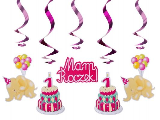 • Dekoracja na roczek dziewczynki: metalizowane świderki o długości 60cm, zakończone papierowym tortem i słonikiem na szczęście. Do tego napis MAM ROCZEK.