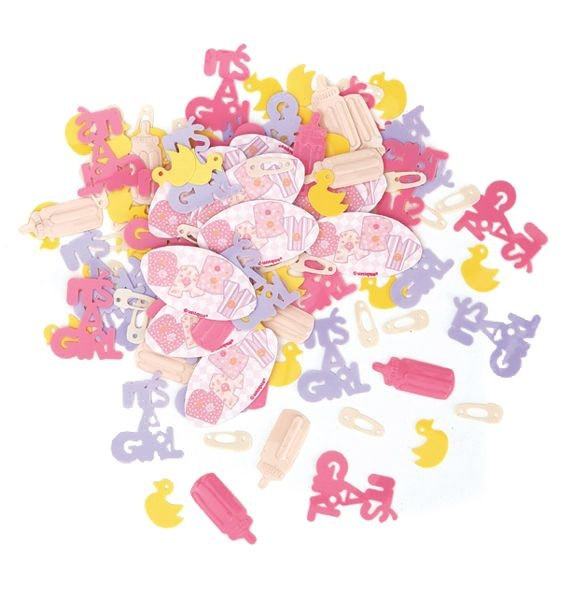 • Delikatne pastelowe konfetti: butelka z mlekiem, kaczuszka, agrafka, napis BABY.
