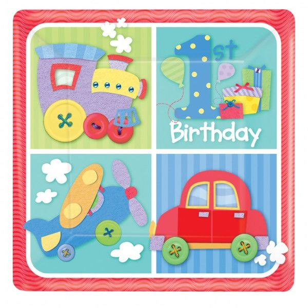 • Na talerzykach znajdują się: auto, lokomotywa, samolot oraz napis 1 Birthday.