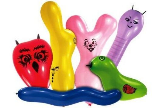 • Zabawne balony lateksowe w kolorach zielonym, różowym i niebieskim.