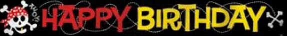 • Na środku napis Happy Birthday. W lewym górnym rogu trupia czacha w pirackiej czerwonej chustce.