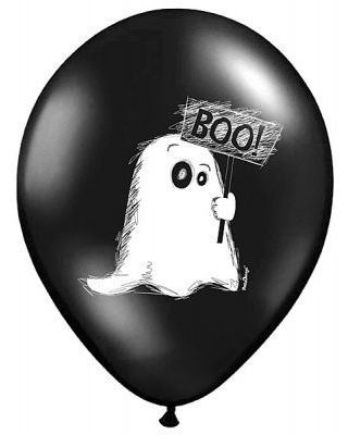 • Na czarnym tle sympatyczny duszek i napis "boo", na drugiej stronie balonu straszny dom.