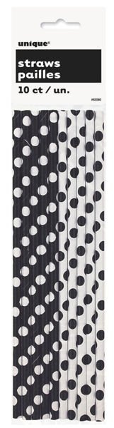 • 10 słomek-rurek do napojów w białe i czarne kropki.