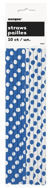 • 10 słomek-rurek do napojów w białe i niebieskie kropki.
