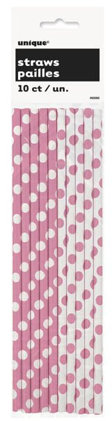 • 10 słomek-rurek do napojów w białe i różowe kropki.
