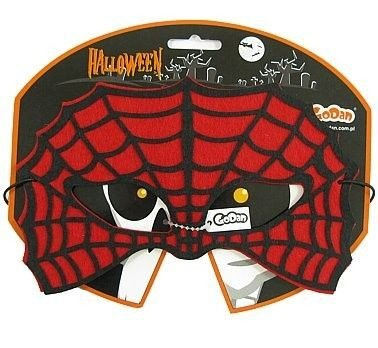 • Czarna pajęczyna na czerwonym tle, z otworami na oczy i gumką do zamocowania wokół głowy.