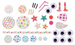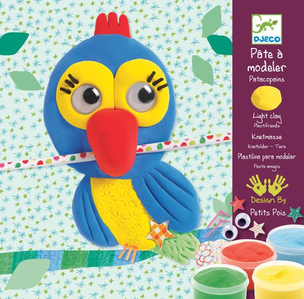 W zestawie 4 kartki ze wzorem, który dziecko ma pokolorować dołączonymi 4 kolorowymi masami  i zestaw koralików i naklejek, którymi można ozdobić wykonane prace.