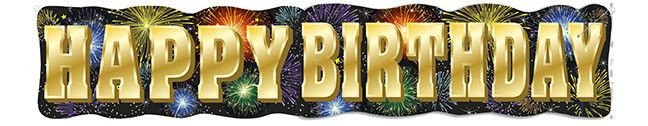 • Wykonany z tekturki baner o wymiarach 137cm x 25cm z dużym, złotym napisem Happy Birthday.