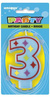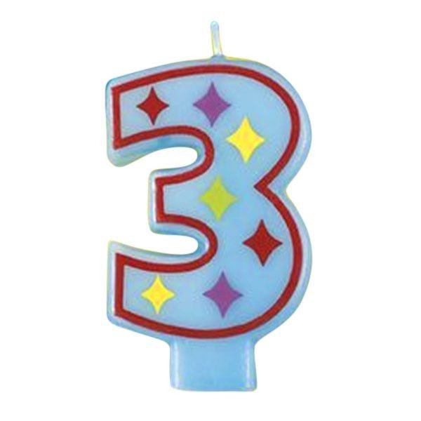 • Świeczka urodzinowa- trójka, niebieska, w kolorowe romby.