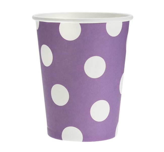• Ekologiczne kubeczki z białymi groszkami na fioletowym tle.