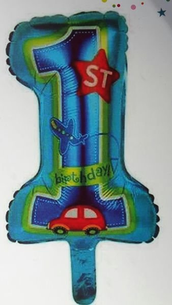 • Błękitny balon z samolotem, samochodzikiem i napisem 1 birthday.