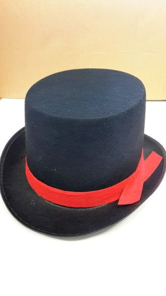 • Kapelusz typu cylinder w kolorze czarnym z czerwoną lamówką wokół.