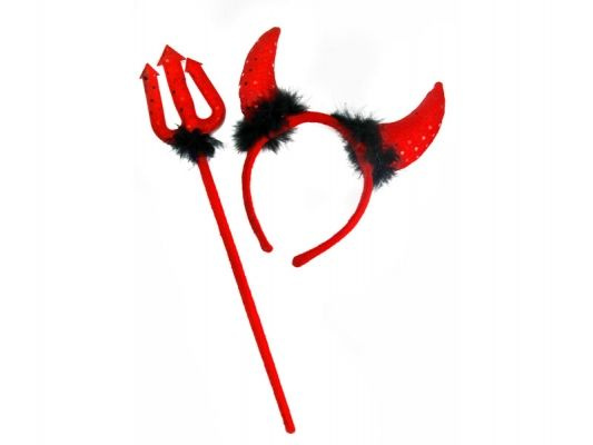 • W zestawie opaska z czerwonymi różkami i trójząb.