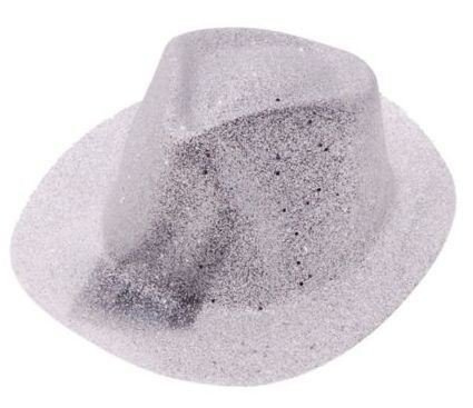 • Plastikowy kapelusz w stylu gangsterskim obsypany srebrnym brokatem.